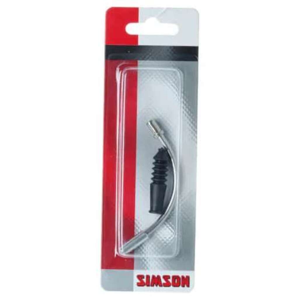 De Simson Remkabelbuis V-Brake verbindt de remkabel en het V-brake remsysteem in een hoek van 90° met elkaar. Hierdoor wordt de remkracht correct overgebracht op het V-Brake remsysteem. Sluit de buitenkabel aan op de remkabelbuis. Trek de binnenkabel van de rem door de remkabelbuis en sluit de binnenkabel aan op het V-brake remsysteem met een inbussleutel. De Simson remkabelbuis wordt geleverd inclusief stofrubber.